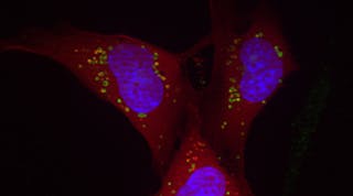 Os autofagosomas (em verde) envolvem partes do citoplasma, neste caso agregados de proteínas desdobradas (vermelho). Se se acumularem, tais agregados produzirão danos graves que acabarão por causar a morte celular.